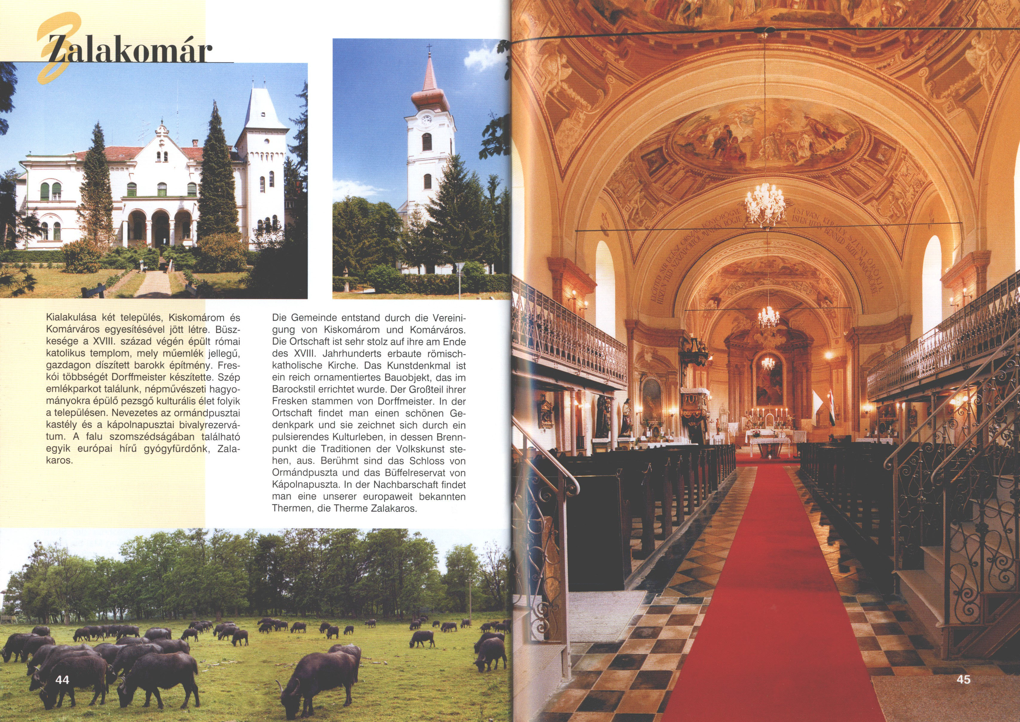 Nyilvános 1962 | 6299 | Zalakomár | Die Gemeinde entstand durch die Vereinigung von Kiskomárom und Komárváros. Die Ortschaft ist sehr stolz auf ihre am Ende des XVIII. Jahrhunderts erbaute römischkatholische Kirche. Das Kunstdenkmal ist ein reich ornamentiertes Bauobjekt, das im Barockstil errichtet wurde. Der Großteil ihrer Fresken stammen von Dorffmeister. In der Ortschaft findet man einen schönen Gedenkpark und sie zeichnet sich durch ein pulsierendes Kulturleben, in dessen Brennpunkt die Traditionen der Volkskunst stehen, aus. Berühmt sind das Schloss von Ormándpuszta und das Büffelreservat von Kápolnapuszta. In der Nachbarschaft findet man eine unserer europaweit bekannten Thermen, die Therme Zalakaros. Dieses Text stammt von: Titel: Hívogató a Régiók Kapujában - Útikönyv Látnivalók Nagykanizsán és Térségében (Einladend in dem Tor des Gebiets - Reisebuch - Sehenswürdigkeiten in Nagykanizsa und Umgebung) Herausgegeben von: Nagykanizsa és a Környező Települések Területfejlesztési Társulása (Verein für Gebietsentwicklung in Nagykanizsa und in ihrer Umgebung) 8800 Nagykanizsa, Petőfi Sándor út 5. Tel.: 06 93/536-453 • 06 93/536-454 Tel ./Fax: 06 93/326-323 E-mail: terstars@axelero.hu www.kanizsaterseg.celodin.hu |
