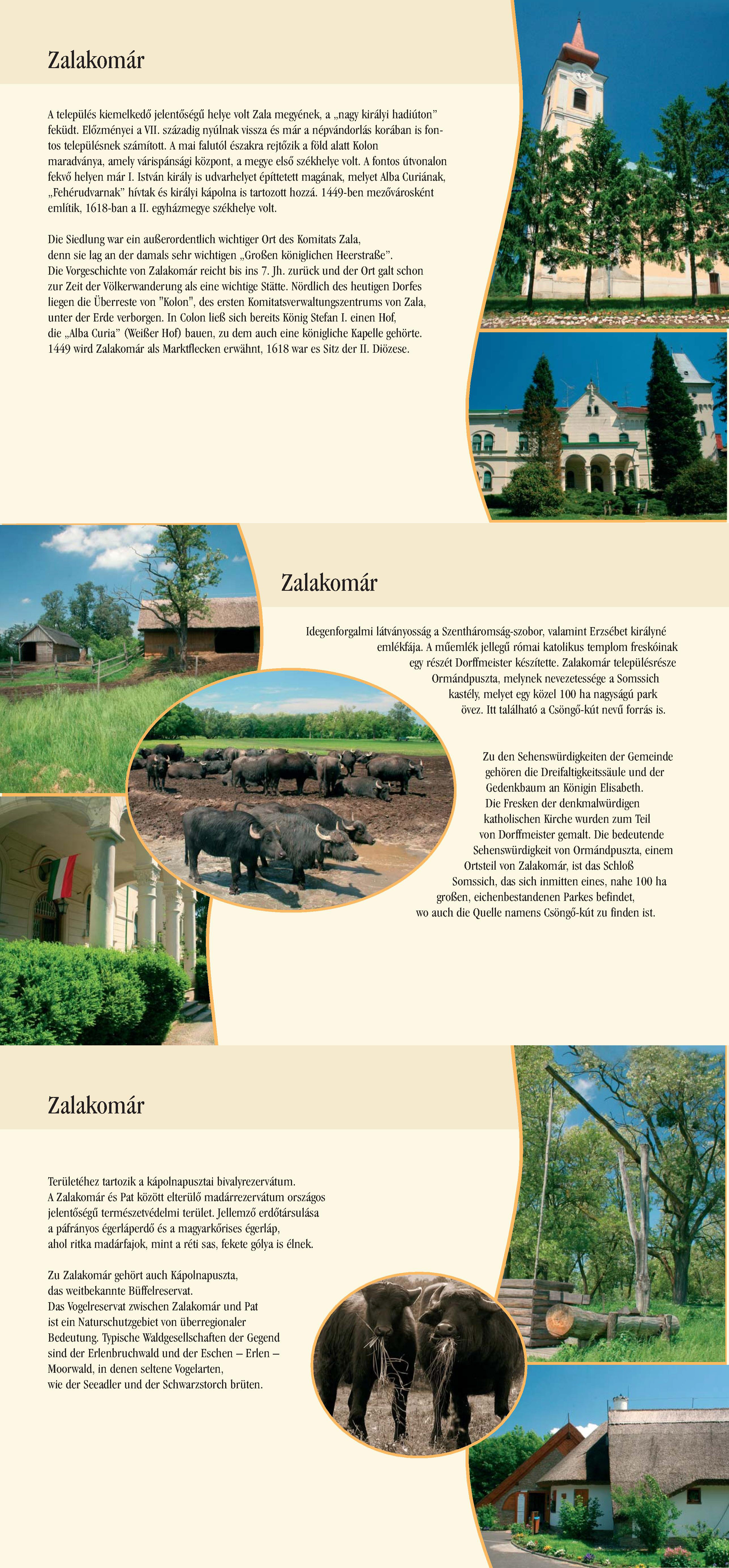 Nyilvános 1931 | 5611 | Zalakomár | Die Siedlung war ein außerordentlich wichtiger Ort des Komitats Zala, denn sie lag an der damals sehr wichtigen ,,Großen königlichen Heerstraße". Die Vorgeschichte von Zalakomár reicht bis ins 7. Jh. zurück und der Ort galt schon zur Zeit der Völkerwanderung als eine wichtige Stätte. Nördlich des heutigen Dorfes liegen die Überreste von "Kolon", des ersten Komitatsverwaltungszentrums von Zala, unter der Erde verborgen. In Colon ließ sich bereits König Stefan I. einen Hof, die ,,Alba Curia" (Weißer Hof) bauen, zu dem auch eine königliche Kapelle gehörte. 1449 wird Zalakomár als Marktflecken erwähnt, 1618 war es Sitz der II. Diözese. Zu den Sehenswürdigkeiten der Gemeinde gehören die Dreifaltigkeitssäule und der Gedenkbaum an Königin Elisabeth. Die Fresken der denkmalwürdigen katholischen Kirche wurden zum Teil von Dorffmeister gemalt. Die bedeutende Sehenswürdigkeit von Ormándpuszta, einem Ortsteil von Zalakomár, ist das Schloß Somssich, das sich inmitten eines, nahe 100 ha großen, eichenbestandenen Parkes befindet, wo auch die Quelle namens Csöngő-kút zu finden ist. Zu Zalakomár gehört auch Kápolnapuszta, das weitbekannte Büffelreservat. Das Vogelreservat zwischen Zalakomár und Pat ist ein Naturschutzgebiet von überregionaler Bedeutung. Typische Waldgesellschaften der Gegend sind der Erlenbruchwald und der Eschen - Erlen - Moorwald, in denen seltene Vogelarten, wie der Seeadler und der Schwarzstorch brüten. Dieses Text stammt von: Pannonhát tájpark prospektus 2006. Web: http://www.pannonhat.hu/ (auch in Deutsch) |