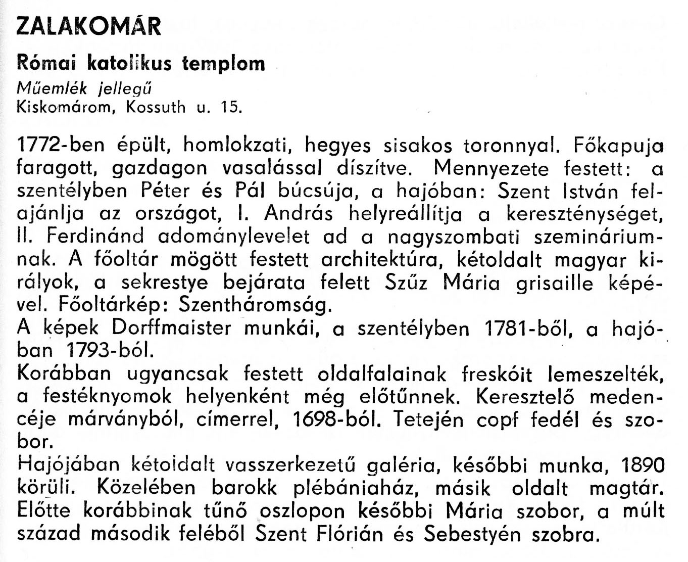 Nyilvános 1845 | 4937 | Zalakomár - Zala megye műemlékei 1977 097old | A részlet szövege: ZALAKOMÁR Római katolikus templom Műemlék jellegű Kiskomárom, Kossuth u. 15. 1772-ben épült, homlokzati, hegyes sisakos toronnyal. Főkapuja faragott, gazdagon vasalással díszítve. Mennyezete festett: a szentélyben Péter és Pál búcsúja, a hajóban: Szent István felajánlja az országot, I. András helyreállítja a kereszténységet, II. Ferdinánd adománylevelet ad a nagyszombati szemináriumnak. A főoltár mögött festett architektúra, kétoldalt magyar királyok, a sekrestye bejárata felett Szűz Mária grisaille képével. Főoltárkép: Szentháromság. A képek Dorffmaister munkái, a szentélyben 1781-ből, a hajóban 1793-ból. Korábban ugyancsak festett oldalfalainak freskóit lemeszelték, a festéknyomok helyenként még előtűnnek. Keresztelő medencéje márványból, címerrel, 1698-ból. Tetején copf fedél és szobor. Hajójában kétoldalt vasszerkezetű galéria, későbbi munka, 1890 körüli. Közelében barokk plébániaház, másik oldalt magtár. Előtte korábbinak tűnő oszlopon későbbi Mária szobor, a múlt század második feléből Szent Flórián és Sebestyén szobra. A részlet a következő könyvből származik: Cím: Zala megye műemlékei Szerző: Németh József (1928) Közreműködő: Lantos Miklós (fotó) Szerz. közl.: Németh József ; [fotók... Lantos Miklós] Kiadás: Zalaegerszeg : Zalai Ny., 1977 ETO jelzet: 72(439.121) ; 7.025.3/.4 ; 908.439.121 Tárgyszó: Zala megye Szakjelzet: 908 Cutter: N 53 Nyelv: magyar Oldalszám: 109 p. |