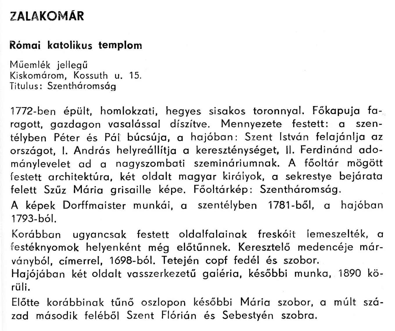 Nyilvános 1858 | 4962 | Zalakomár - Zala megye műemlékei 1979 117old | A részlet szövege: ZALAKOMÁR Római katolikus templom Műemlék jellegű Kiskomárom, Kossuth u. 15. Titulus: Szentháromság 1772-ben épült, homlokzati, hegyes sisakos toronnyal. Főkapuja faragott, gazdagon vasalással díszítve. Mennyezete festett: a szentélyben Péter és Pál búcsúja, a hajóban: Szent István felajánlja az országot, I. András helyreállítja a kereszténységet, II. Ferdinánd adománylevelet ad a nagyszombati szemináriumnak. A főoltár mögött festett architektúra, két oldalt magyar királyok, a sekrestye bejárata felett Szűz Mária grisaille képe. Főoltárkép: Szentháromság. A képek Dorffmaister munkái, a szentélyben 1781-ből, a hajóban 1793-ból. Korábban ugyancsak festett oldalfalainak freskóit lemeszelték, a festéknyomok helyenként még előtűnnek. Keresztelő medencéje márványból, címerrel, 1698-ból. Tetején copf fedél és szobor. Hajójában két oldalt vasszerkezetű galéria, későbbi munka, 1890 körüli. Előtte korábbinak tűnő oszlopon későbbi Mária szobor, a múlt század második feléből Szent Flórián és Sebestyén szobra. A részlet a következő könyvből származik: Cím: Zala megye műemlékei Szerző: Németh József (1928) Közreműködő: Vándor László (szerk.) ; Szabóky Zsolt (1941) (fotó) Szerz. közl.: Németh József ; [szerk. Vándor László] ; [fotók... Szabóky Zsolt] Kiadás jelzés: 2. bőv. kiad. Kiadás: Zalaegerszeg : Zalai Ny., 1979 ETO jelzet: 72(439.121) ; 7.025.3/.4(439.121) ; 908.439.121 Tárgyszó: Zala Szakjelzet: 908 Cutter: N 53 Nyelv: magyar Oldalszám: 134 p. |