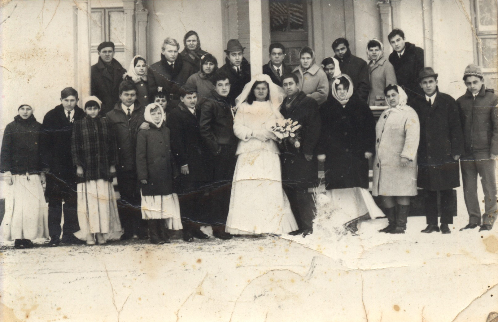 Nyilvános 1666 | 4027 | 1970-75 körül Baranyai Ibolya és Baranyai József esküvője - hátsó sor 3. Baranyai József 6. Csizmadia József, utolsó Horváth József. Első sor, a férjtől jobbra Horváth Rózsa, Horváth Istvánné, Horváth István és Horváth József. A kép a Kiskomáromi templom előtt készült. | |