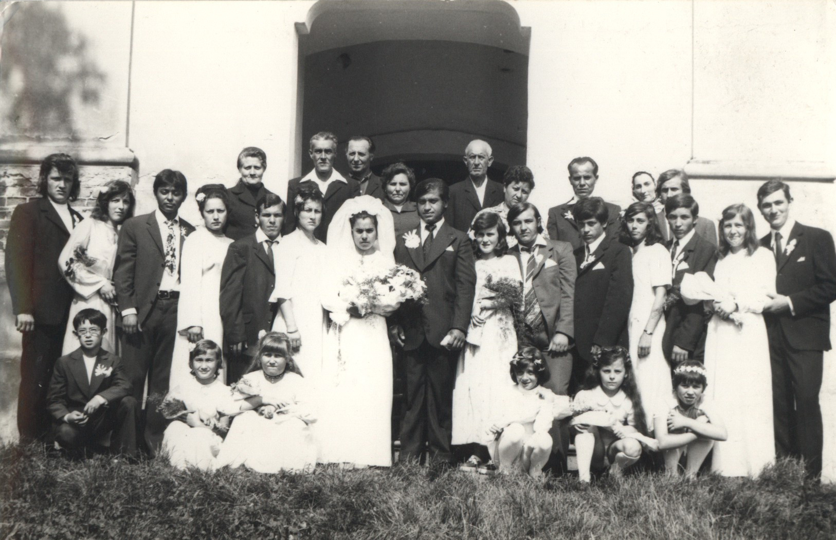 Nyilvános 1645 | 5065 | Kiskomáromi templom előtt. 1975-80-as évek. Baranyai György és Csizmadia Mária esküvője. | Leghátsó sor: 2. Csizmadia Mária apja, Csizmadia Géza. 4. Csizmadia Mária anyja, Csizmadia Gézáné. 5. Baranyai István 6. ismeretlen 7. Horváth István. Első sor: 4. Bonczó Mária 5. Horváth Ferenc 10. Horváth István 13. Tikász Béla |