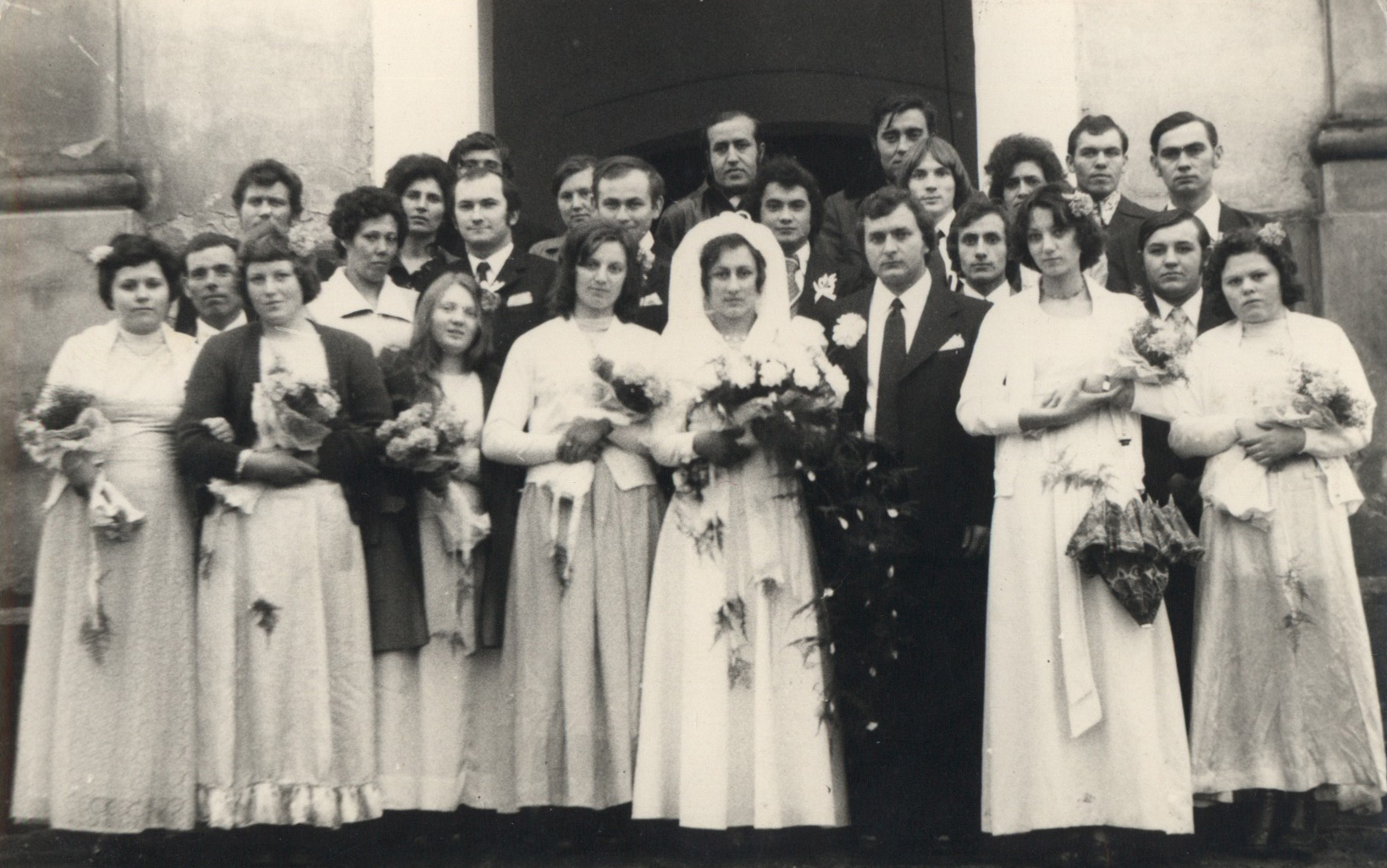 Nyilvános 1654 | 5133 | 1980-85. Kiskomáromi templom előtt. Baranyai József és Horváth Márta esküvője. Első sor: Baranyai Józseftől jobbra: Tarsoly Erika, Horváth István, Barsó Ferencné. Menyasszonytól balra: 3. Paprika Erzsébet, Muszka Lászlóné. | Második sor: 1. Horváth Jenő, Tarsoly Istvánné ... menyasszony mögött jobbra Horváth józsef. Harmadik sor: Jobbról balra: Szőke József, Horváth Ferenc, valamilyen Józsefné, 5. hátul Csizmadia József 6. Baranyai Gyula |
