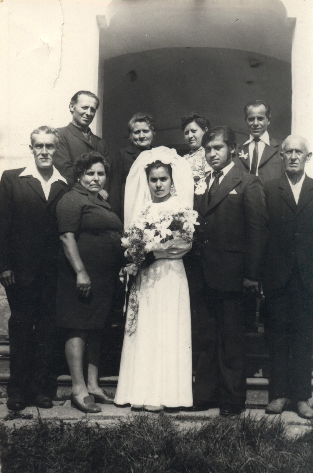 Nyilvános 1597 | 3963 | Kiskomáromi templom előtt. 1975-80-as évek. Baranyai György és Csizmadia Mária esküvője. | Balról jobbra, első sor: Csizmadia Géza, Csizmadia Gézáné, Baranyai Györgyné, Baranyai György, Baranyai István Hátsó sor: 1-2. nem ismert 3. Horváht Istvánné, 4. Horváth István |