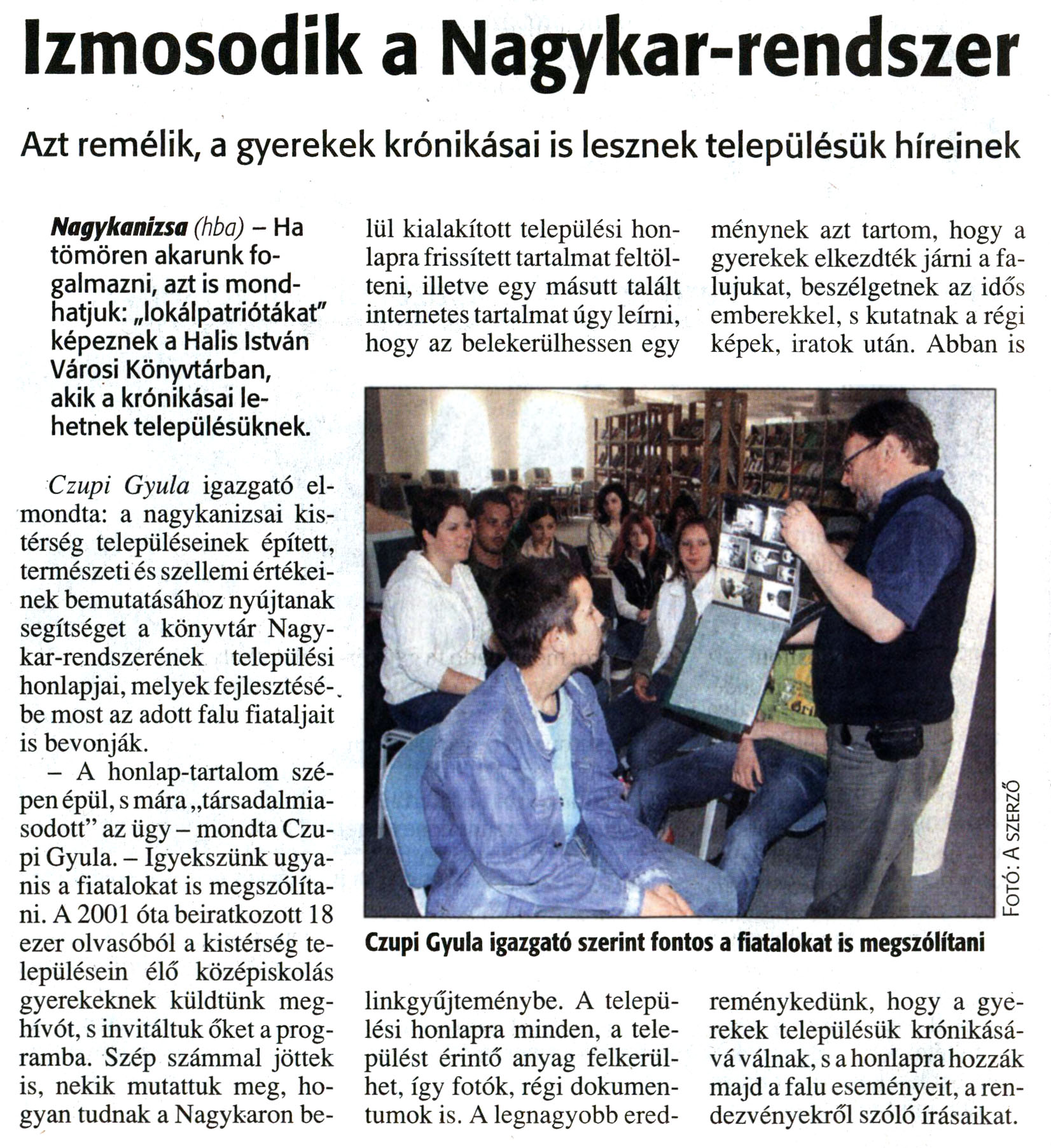 Nyilvános 14196 | 28349 | Zalai Hírlap 2008. június 9. 133. szám 12. oldal - Izmosodik a Nagykar-rendszer | A cikk szövege: Izmosodik a Nagykar-rendszer Azt remélik, a gyerekek krónikásai is lesznek településük híreinek Nagykanizsa (hba) - Ha tömören akarunk fogalmazni, azt is mondhatjuk: „lokálpatriótákat" képeznek a Halis István Városi Könyvtárban, akik a krónikásai lehetnek településüknek. Czupi Gyula igazgató elmondta: a nagykanizsai kistérség településeinek épített, természeti és szellemi értékeinek bemutatásához nyújtanak segítséget a könyvtár Nagykar-rendszerének települési honlapjai, melyek fejlesztésébe most az adott falu fiataljait is bevonják. - A honlap-tartalom szépen épül, s mára „társadalmiasodott" az ügy - mondta Czupi Gyula. - Igyekszünk ugyanis a fiatalokat is megszólítani. A 2001 óta beiratkozott 18 ezer olvasóból a kistérség településein élő középiskolás gyerekeknek küldtünk meghívót, s invitáltuk őket a programba. Szép számmal jöttek is, nekik mutattuk meg, hogyan tudnak a Nagykaron belül kialakított települési honlapra frissített tartalmat feltölteni, illetve egy másutt talált internetes tartalmat úgy leírni, hogy az belekerülhessen egy linkgyűjteménybe. A települési honlapra minden, a települést érintő anyag felkerülhet, így fotók, régi dokumentumok is. A legnagyobb eredménynek azt tartom, hogy a gyerekek elkezdték járni a falujukat, beszélgetnek az idős emberekkel, s kutatnak a régi képek, iratok után. Abban is reménykedünk, hogy a gyerekek településük krónikásává válnak, s a honlapra hozzák majd a falu eseményeit, a rendezvényekről szóló írásaikat. Képaláírás: Czupi Gyula igazgató szerint fontos a fiatalokat is megszólítani |
